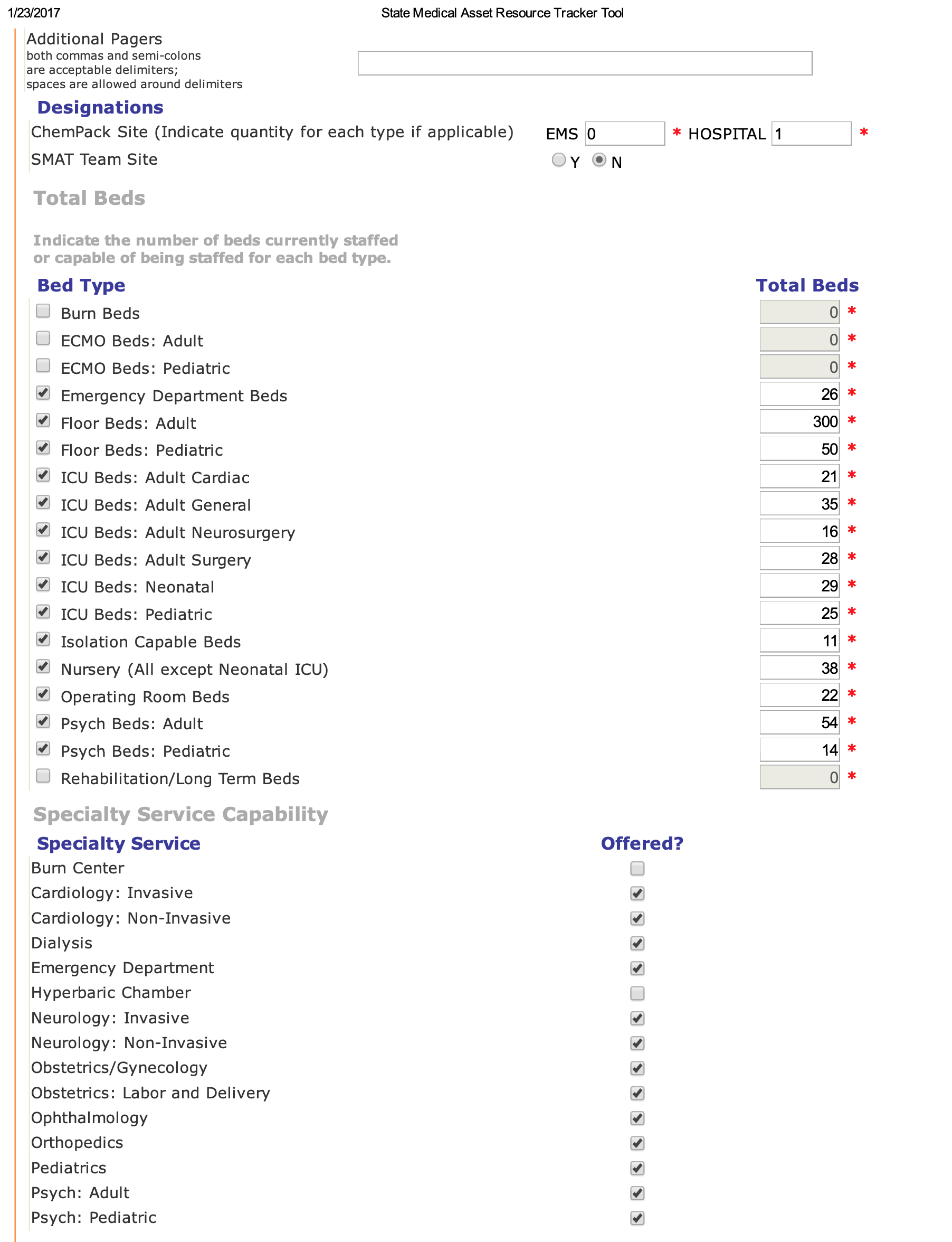 Ability to enter general info, bed counts (by type), equipment, and services per hospital